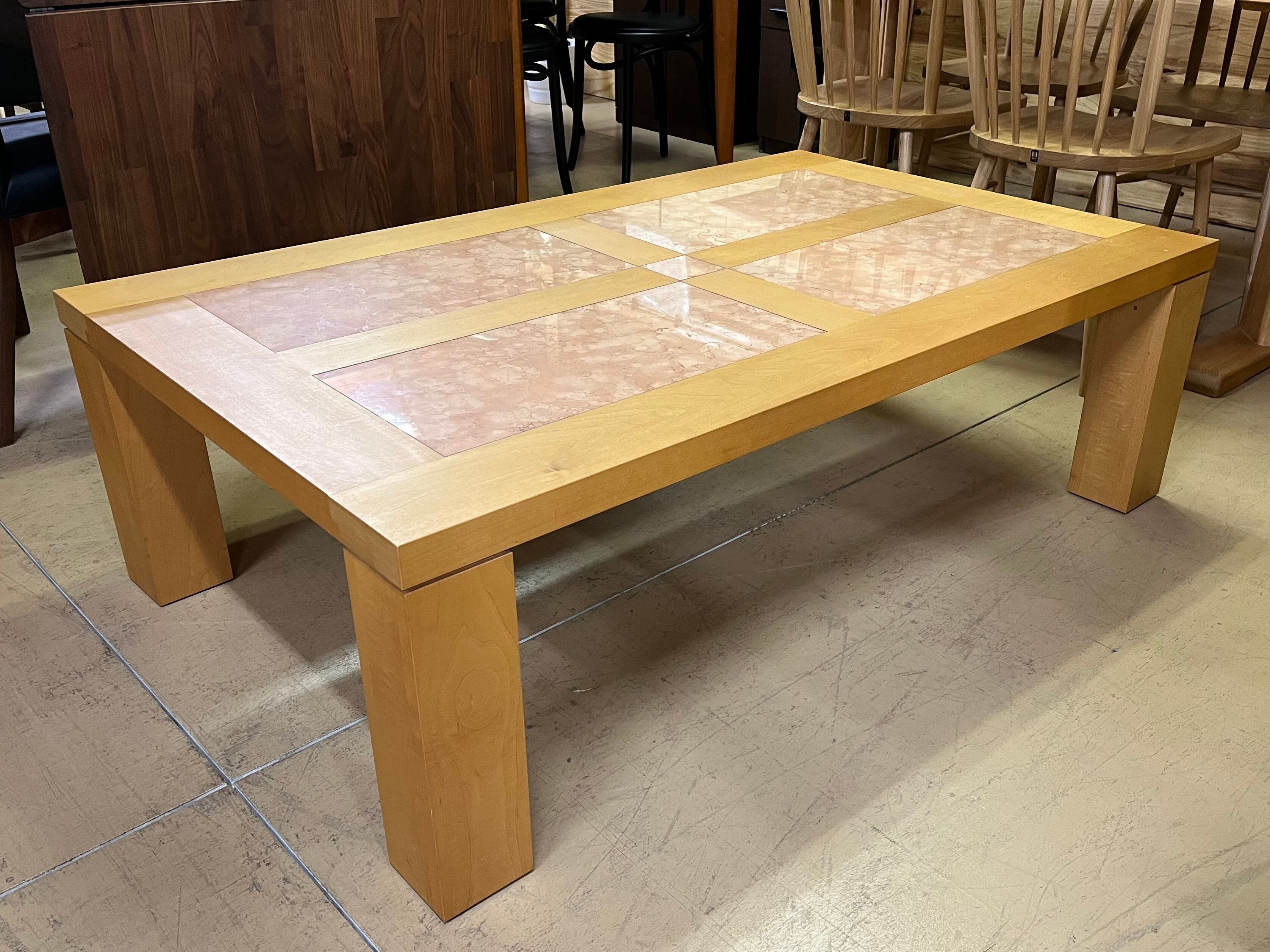 メープル材を使用した昔ながらのセンターテーブルで、天板には天然石のペルリーノロザートをはめ込んだ贅沢な一品。